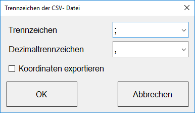 - Mit einem gesetzten Haken bei Koordinaten exportieren, werden zusätzlich zu den Attributen der Datenbank noch Koordinaten im Koordinatensystem WGS84 exportiert. Die Koordinaten werden als Spalten LONGITUDE_X, LATITUDE_Y und ALTITUDE_Z exportiert und enthalten bei Punktebenen die jeweiligen Koordinaten und bei Polygon- bzw. Linienebenen die Mittelpunkte bzw. Durchschnittswerte der Koordinaten.