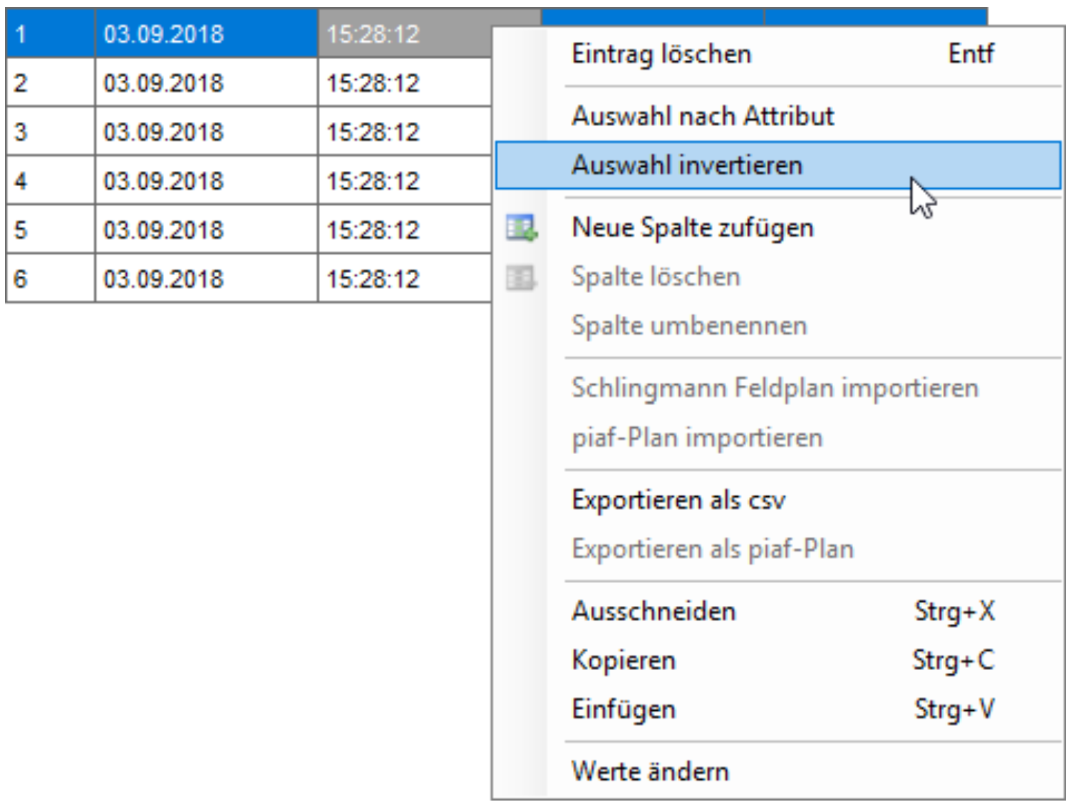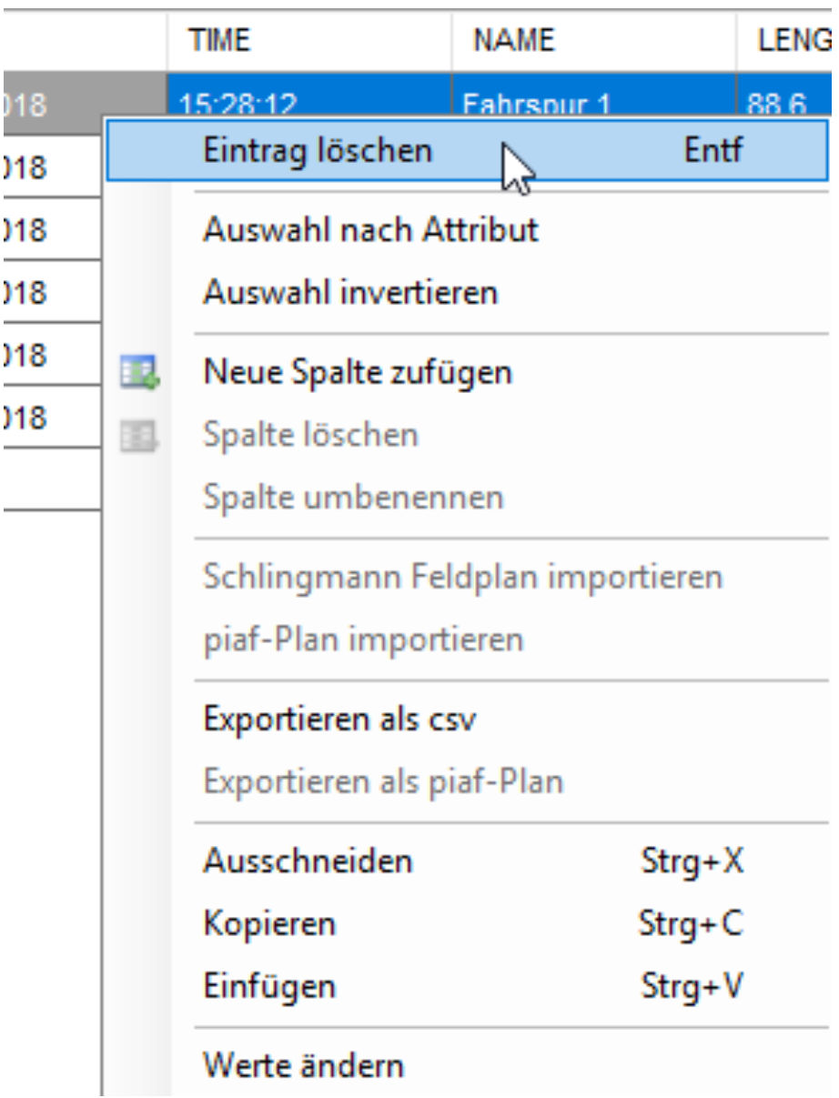 Ein Rechtsklick auf den Spaltenkopf ermöglicht es Spalten zu löschen oder hinzuzufügen.