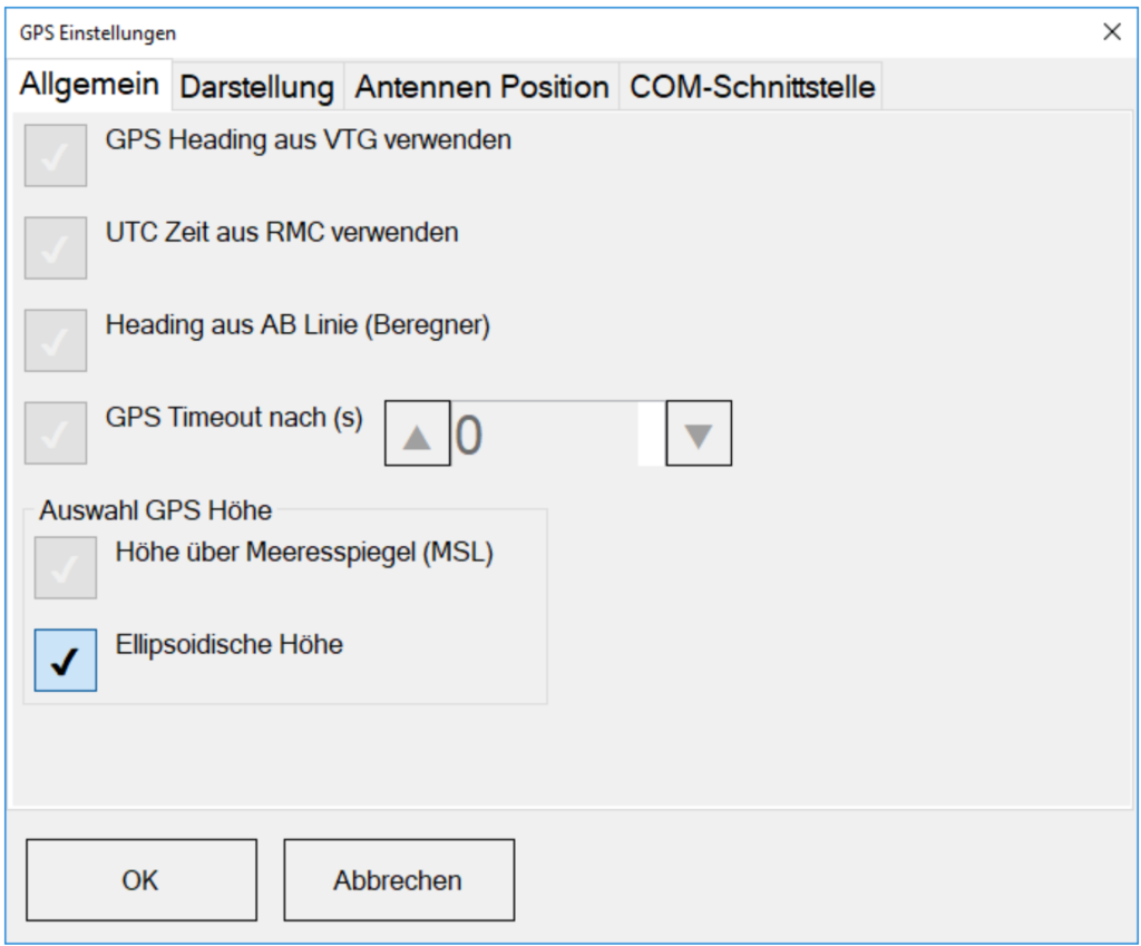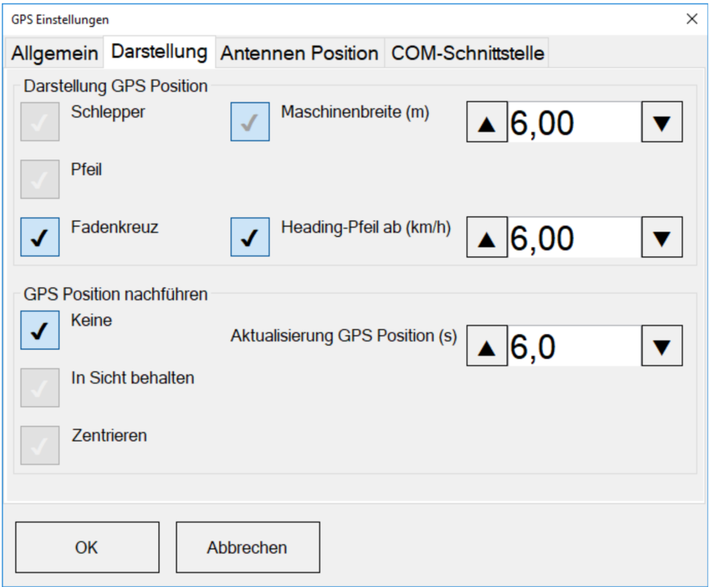 Unter GPS → Allgemein finden Sie verschiedene Optionen die Sie benötigen, wenn Sie MiniGIS auf einem tragbaren Computer mit GPS-Empfänger verwenden, bzw. wenn Sie über eine COM-Schnittstelle die GPS-Positionsdaten in MiniGIS einspeisen wollen