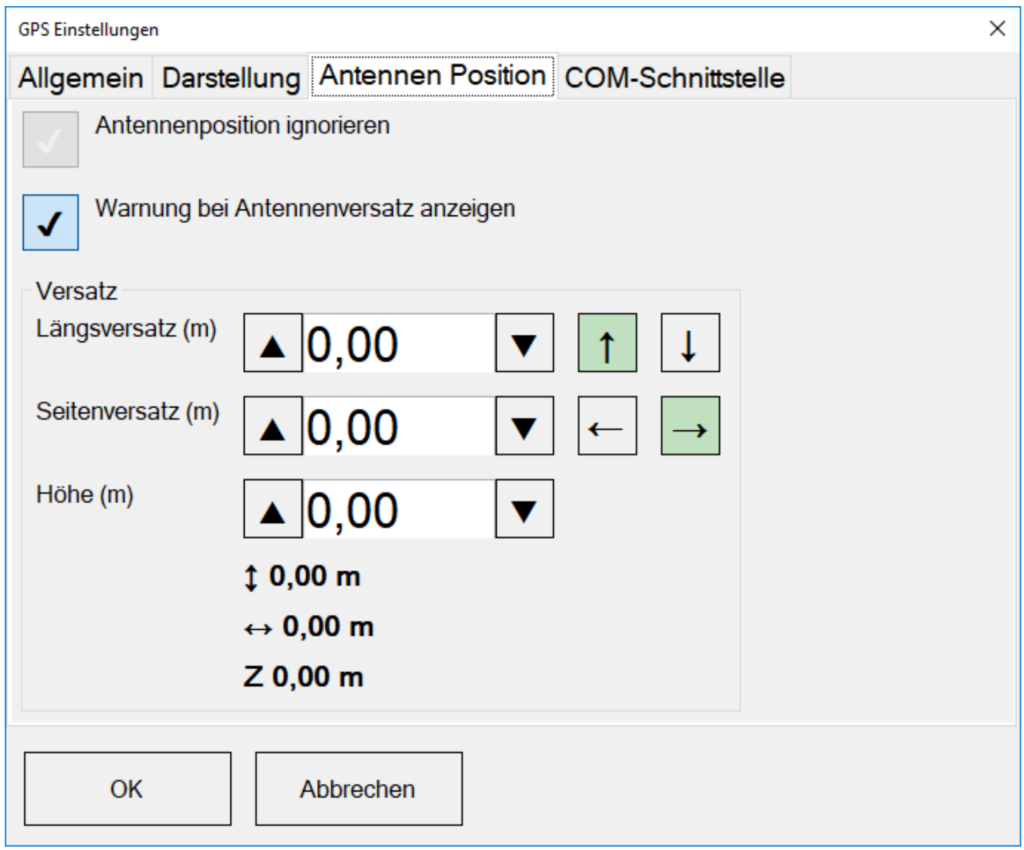 In diesem Fall muss auch die Antennenposition definiert werden: Geben Sie in den dafür vorgesehenen Feldern den Abstand der Antenne zum Fahrzeugreferenzpunkt in Fahrtrichtung und den Abstand der Antenne zum Fahrzeugreferenzpunkt quer zur Fahrtrichtung jeweils in Metern an. Der Fahrzeugreferenzpunkt ist i.d.R. der Mittelpunkt der Hinterachse des Fahrzeugs.