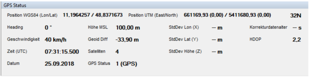 Mit dem Menüpunkt Extras → GPS können Sie die Anzeige der aktuellen Position und weiterer GPS-Daten (z.B. Geschwindigkeit, Richtung) aktivieren. Die Anzeige erfolgt in einem eigenen GPS-Fenster, welches ebenso wie die anderen Fenster in Größe und Anordnung individuell angepasst werden kann.