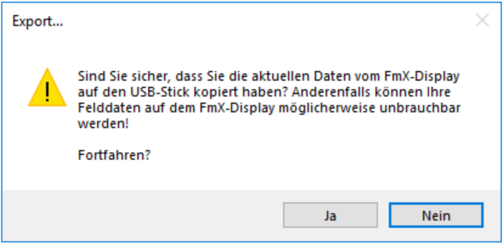 ACHTUNG: Bitte stellen Sie sicher, dass Sie am FmX die AKTUELLEN Dateien unter Dateien → Konfiguration → Merkmale vom Display auf den USB-Stick kopiert haben, bevor Sie den ID-Export nutzen. Wenn dies nicht der Fall ist, so kann es passieren, dass Sie mit den Daten aus MiniGIS Ihre Einstellungen am FmX überschreiben. Dadurch können die Daten, die bereits auf dem FmX-Display gespeichert sind, nicht mehr richtig angezeigt oder gar unbrauchbar werden.