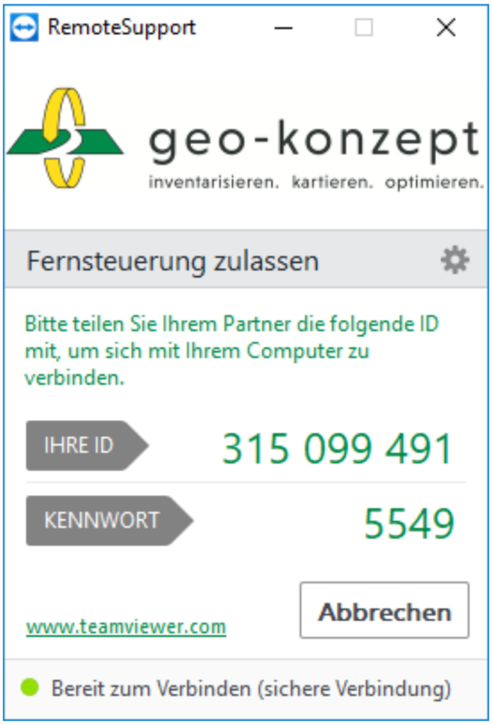 Der Menüpunkt Onlinesupport starten öffnet das Programm TeamViewer, mit welchem ein Support-Mitarbeiter auf Ihren Computer zugreifen und somit bei der Lösung von Problemen mit dem Programm behilflich sein kann.