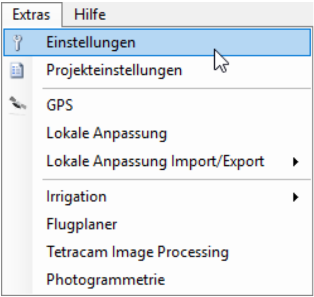 Extras: Menüpunkte für programm- und projektbezogene Einstellungen. Hier kann auch das GPS aktiviert werden.