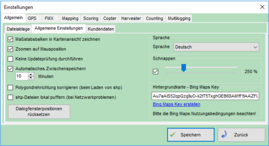 Unter Allgemein → Allgemeine Einstellungen können Sie zum Beispiel festlegen, ob ein Maßstabsbalken in der Karte gezeichnet werden soll. Hier können Sie auch die automatische Updateprüfung ausschalten, falls diese nicht von Ihnen erwünscht ist.